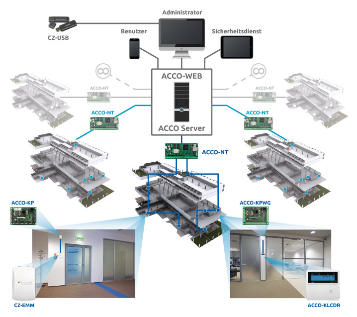 Ein Zutrittskontrollsystem soll Unberechtigte fernhalten und Berechtigte so wenig wie möglich behindern Das ACCO-System bietet Ihnen alles von der Kontrolle einer einzelnen Tür bis zur IP-vernetzten Lösung mehrerer Standorte mit vielen Tausend Benutzern und Zutrittspunkten. |