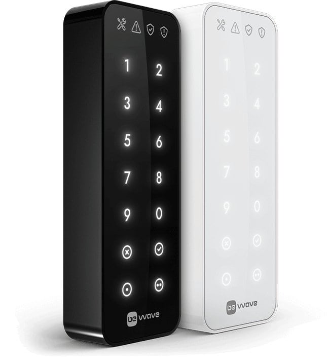 Das elegante Smart Keypad ist ein Funkbedienteil für die BE WAVE-Systeme. Es kann sowohl zur Scharf-Unscharfschaltung genutzt werden als auch zum Ausführen von Makros, die beim Verlassen des Hauses beispielsweise Scharfschalten, das Licht Löschen und die Rollos schließt. Schnell und einfach.