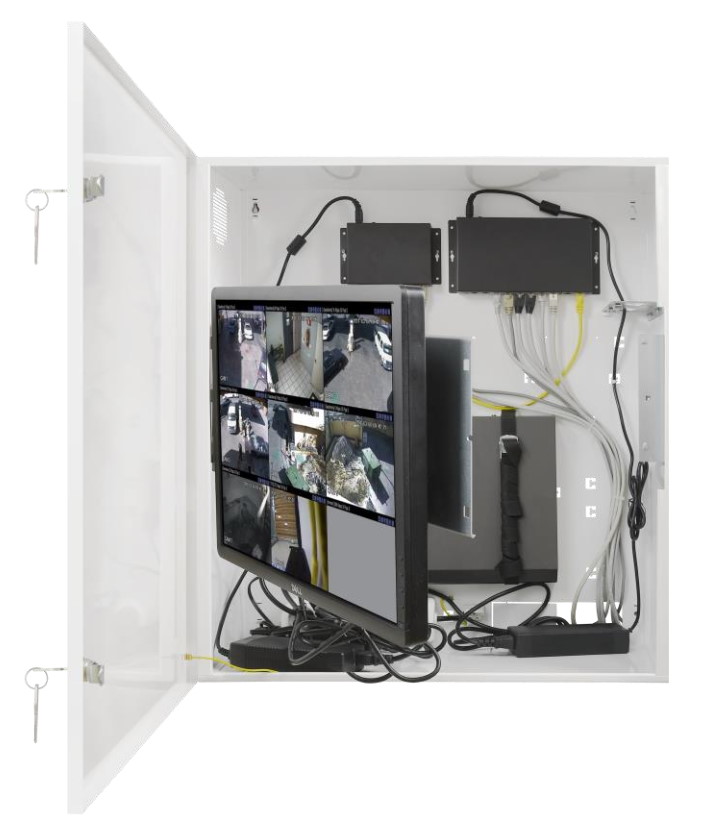 Das Gehäuse AWO531W schützt den Rekorder vor unbefugtem Zugriff oder Diebstahl und bietet Platz für die gesamte CCTV-Technik inklusive Monitor (bis 22″), Switche, Netzteile und Akkupufferung. Durch die beiliegenden Montagewinkel ist auch die Installation von 19″-Technik möglich. Das Gehäuse besteht aus Stahl mit einer Dicke von 1 mm. Es ist mit zwei Schlössern (unterschiedliche Codierung) und zwei Sabotageschaltern für Öffnung und Abriss ausgestattet. Aufgrund der vertikalen Installation und geringen Tiefe, ist es ideal für Orte, an denen tiefere Gehäuse oder 19″ Schränke nicht eingesetzt werden können. Das AWO531W erfüllt die Anforderungen der Zugriffssicherung für Videoüberwachungssysteme nach DSGVO.