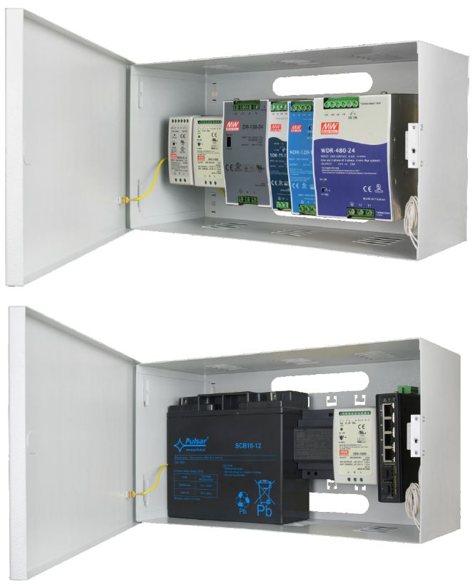 Das Gehäuse verfügt über vorbereitete Löcher für die Montage von 1 DIN-Schiene mit einer Länge von 320 mm. Die Schiene wird direkt am Gehäuse oder an Kunststoffhalterungen montiert, die einen Abstand der Schiene um 20 mm von der Rückwand ermöglichen. Zusätzlich existieren Löcher für die einfache Montage von Transformatoren sowie Pufferstromversorgungen.