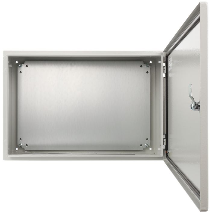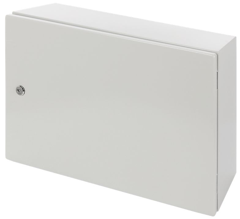 Gehäuse und Tür bestehen aus 1,2 mm starkem Blech, die Montageplatte aus 1,5 mm starkem Blech. Dies gewährleistet eine hohe Widerstandsfähigkeit gegen mechanische Beschädigungen – Widerstandsklasse IK10 (Grad der mechanischen Festigkeit IK).
