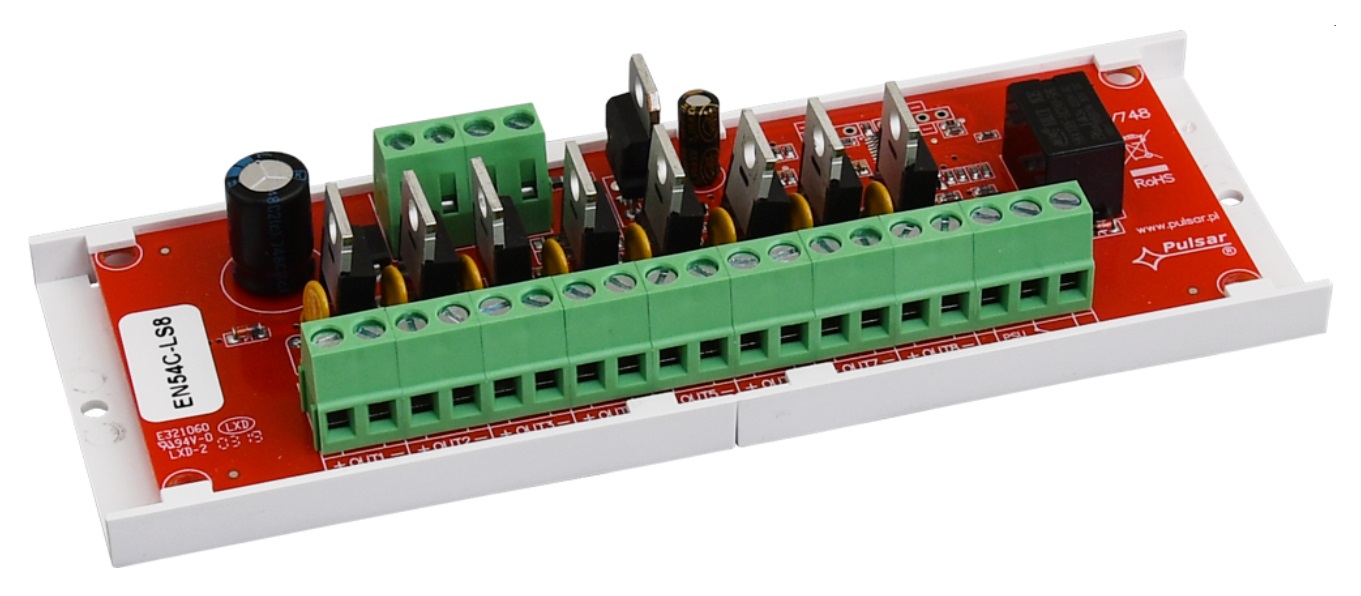 Wenn mehrere elektrische Stellglieder angeschlossen sind, stellt der oben genannte Überstrom ein Risiko für die Zuverlässigkeit Stromversorgung dar (z.B. Auslösen des Schutzschalters der Ausgangsschaltung), obwohl der Maximalstrom nicht überschritten wurde. Das Modul EN54C-LS8 bewirkt, dass die an seine Ausgänge angeschlossenen Empfänger mit einer Verzögerung von 100 ms sequentiell geschaltet werden. Dank dieser Lösung wird der Stoßstrom auf den Wert reduziert, der den korrekten Betrieb des Netzteils gewährleistet. Damit ermöglicht es den sicheren Anschluss weiterer Stellglieder. Alle Ausgänge sind unabhängig voneinander durch PTC-Polymersicherungen geschützt und verfügen über LED-Dioden, die die Aktivierung der einzelnen Ausgänge signalisieren. Das Modul wird beispielsweise über einen Kontakt der Brandmeldezentrale gesteuert.