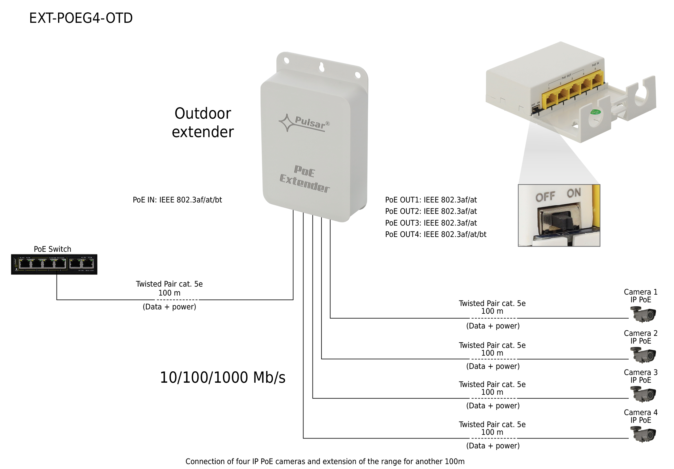 Der PoE-Extender/Switch EXT-POEG4-OTD verlängert die Reichweite einer PoE-Verbindung um zusätzliche 100 Meter. Das Gerät wird selbst über PoE versorgt und kann bis zu vier Kameras mit PoE versorgen (maximal 50W Gesamtleistung). Der Extender verfügt sowohl über eine Überlast- als auch eine Kurzschlusssicherung und ist für die Verwendung im Außenbereich geeignet.