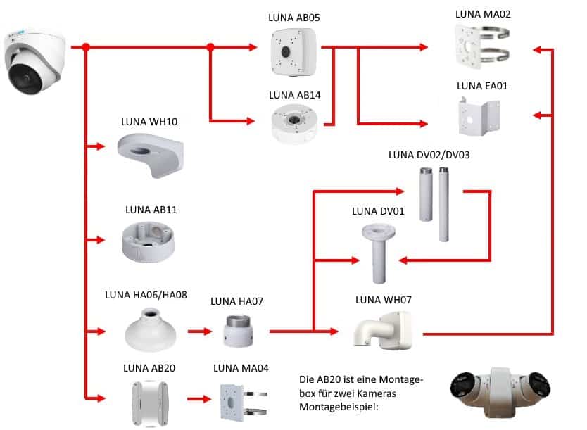 Die LUNA DK2200-P ist eine kompakte HD-CVI Dome Kamera mit IR-Strahler (max. 30 m) für den Innen- und Außeneinsatz (IP67). Umschaltbar über OSD kann das Signal über den BNC-Ausgang auch als CVBS, AHD oder TVI ausgegeben werden. HD-CVI ist ein Standard zur Langstreckenübertragung (max. 800 m, kabelabhängig) von HD-Videobildern (720p, 1080p) über konventionelle Koax-Kabel. Neben dem Video können auch Audiosignale (modellabhängig) und Daten über das gleiche Kabel übertragen werden. Der CMOS Sensor liefert eine max. Auflösung von 2 Megapixel (1920 x 1080 px) mit bis zu 25 Bildern pro Sekunde. Die Kamera ist mit einem 2,8 mm Festbrennweiten-Objektiv ausgestattet und verfügt über einen mechanischen IR Cut Filter (ICR). Einstellungen an der Kamera können komfortabel über das Koaxialkabel im OSD (OnScreenDisplay) der Kamera vorgenommen werden. Die Spannungsversorgung erfolgt über 12 V DC oder über PoC (Power over Coax) auch direkt über das Kabel (bis zu 400 m Reichweite). Eine PoC-Einspeisung durch z.B. Rekorder wird benötigt.