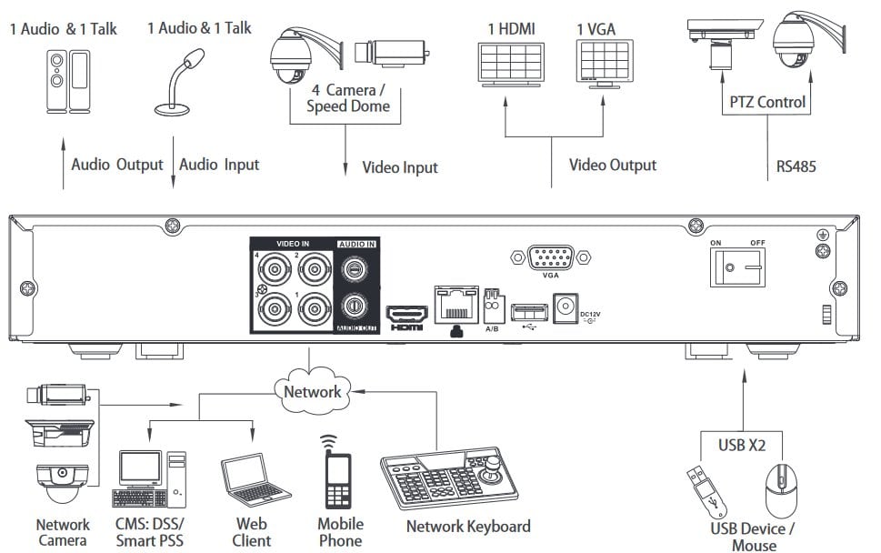 Der LUNA DVR2104-4K ist ein standalone Hybrid-Rekorder für bis zu 4 BNC-Kamerasignale. Wahlweise können HD-CVI, TVI, AHD oder analoge Signale angelegt werden (Autoerkennung). Zusätzlich können 4 IP-Signale (bis 8 MP) aufgezeichnet werden. Das Gerät verfügt über Videoanalyse (IVS) und Funktionen zur Gesichtererkennung. Die Daten können auf einer internen SATA HDD (bis 16 TB) gespeichert werden. Das intuitive Menü des Rekorders kann komfortabel mit der Maus bedient werden. Des Weiteren verfügt das Gerät über eine Netzwerkschnittstelle mit der via Webbrowser oder Management Software (lunaCMS) die Videobilder angezeigt, verwaltet und konfiguriert werden können.