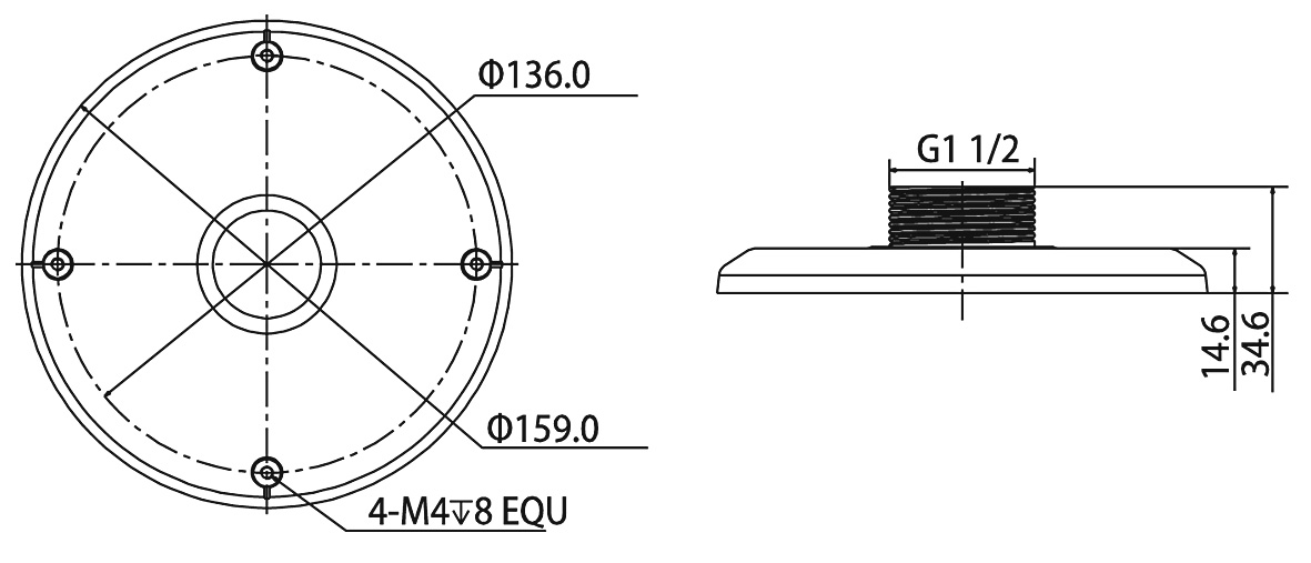 Adapter für Domekameras zur Verbindung von Domekameras an Wand- oder Deckenhalter mit Standard-Gewinde (NPT 1 1/2″).