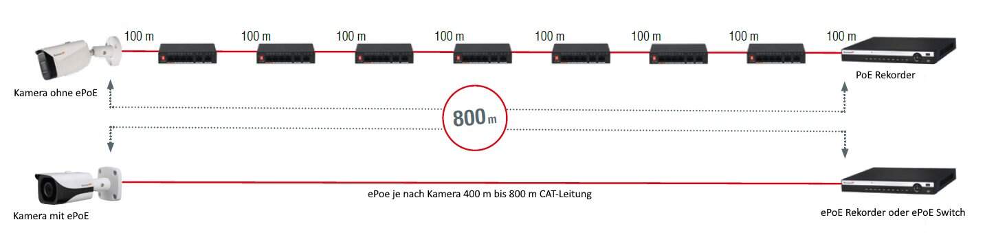 ePoE bedeutet – extended Power over Ethernet. Diese Technologie überträgt das Videosignal, das Audiosignal, die Steuerdaten und die Stromversorgung für eine ePoE fähige Kamera auf einer Länge von bis zu 400/800 Metern (je nach Kamera). Bei der klassischen PoE-Technik wird nach einer Länge von 100 Metern ein Netzwerkswitch oder ein PoE-Extender benötigt. Durch ePoE enstehen weniger Installation- und Wartungskosten.