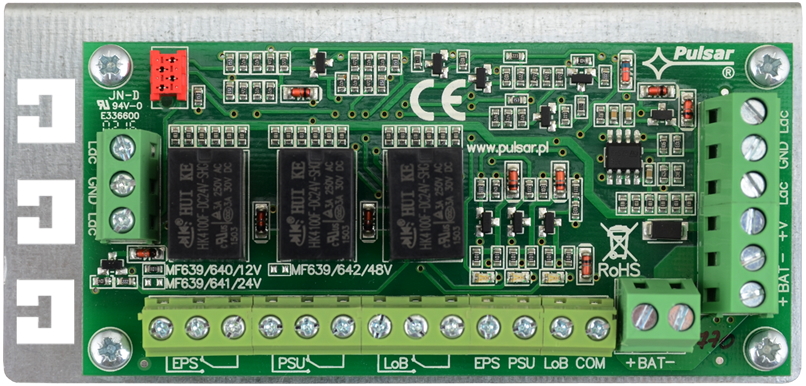 Das Ausgangsmodul MPSB12 dient zur Anzeige des Betriebszustands der 12V-Puffernetzteile vom Typ PSBxx und HPSBxx (alte Version). Auf dem Modul befinden sich LEDs, die den Betriebszustand des Netzteils anzeigen (Anliegen der AC-Spannung, Anliegen des DC-Spannung, Batteriespannung). Das Modul ist zudem mit technischen Relaisausgängen und Open-Collector-Ausgängen ausgestattet, welche folgende Zustände anzeigen: fehlendes AC-Netz, Störung des Netzteils, schwache Batteriespannung.