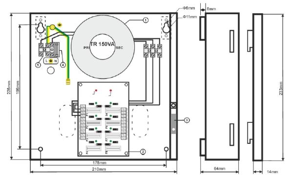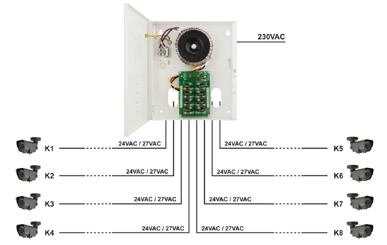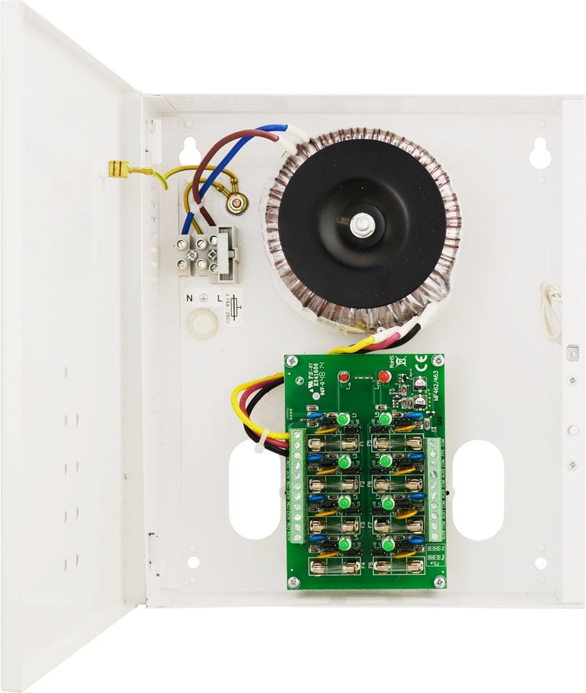 Das PSAC08246 ist ein Zentralnetzteil im Metallgehäuse mit effizientem Ringkerntrafo. Es ist der Anschluss von 8 Kameras mit je 24 Volt AC möglich. Jeder Anschluss ist einzeln abgesichert.