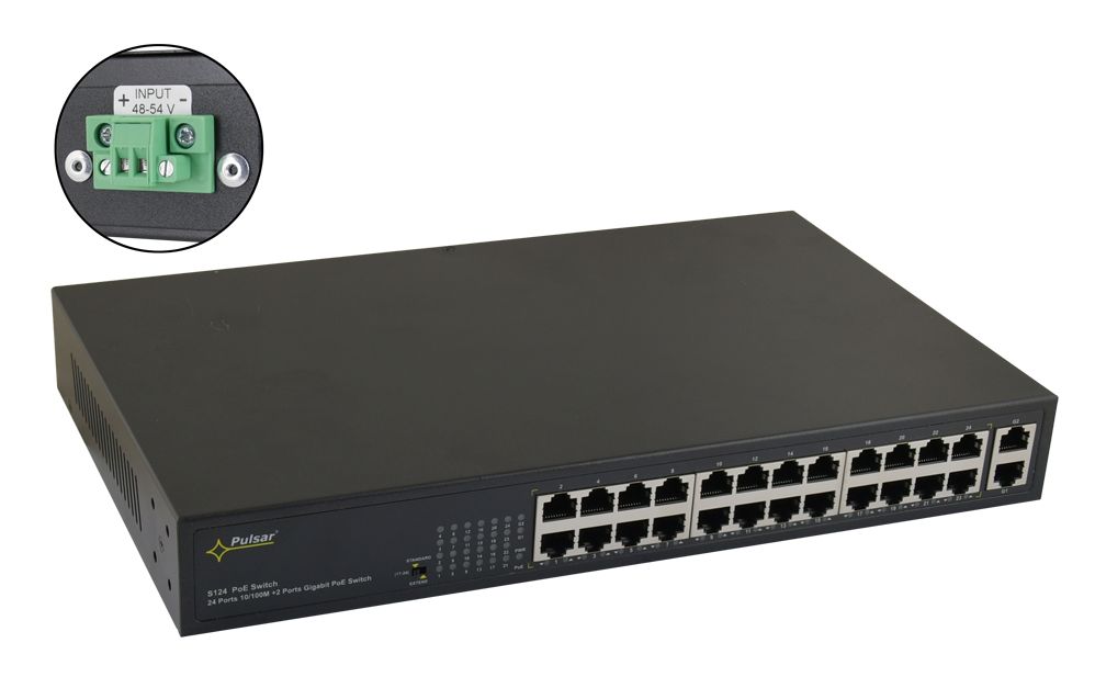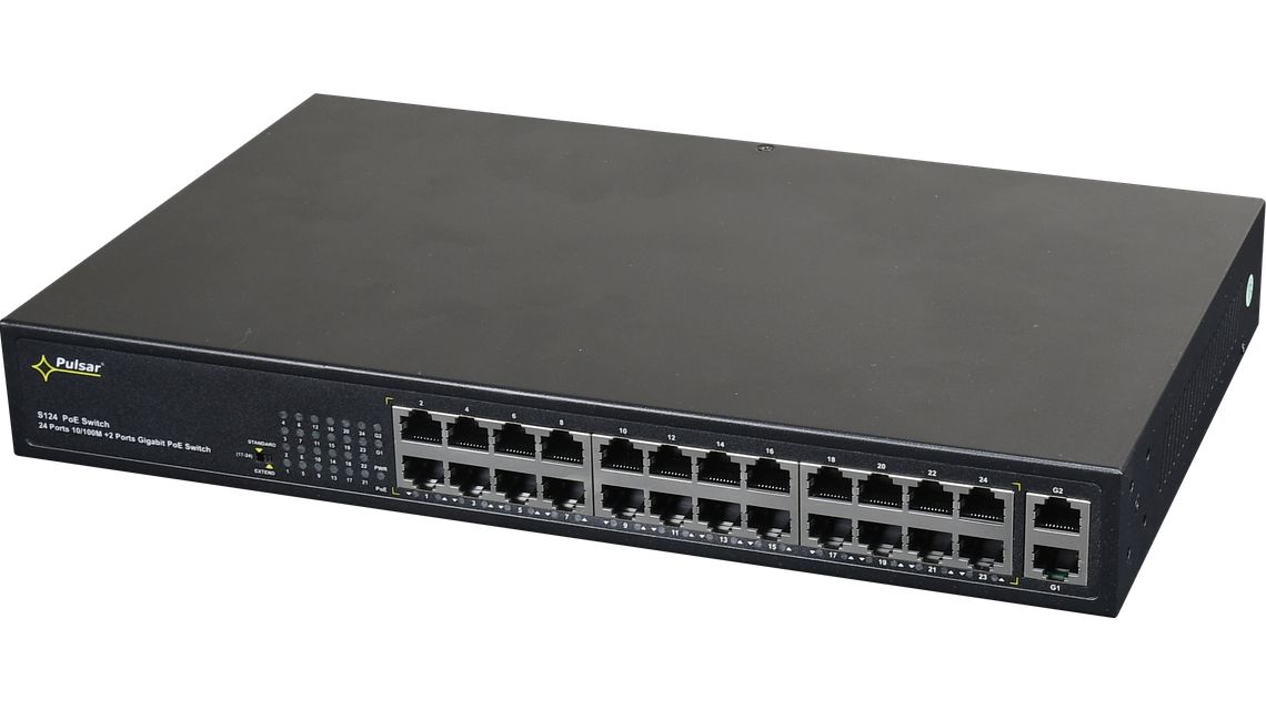 Der S124WP ist ein 24-Port PoE+-Switch und für die Versorgung von bis zu 24 IP Kameras geeignet ist (IEEE 802.3af/at Standard). Der Switch verfügt über eine automatische Erkennung des PoE/PoE+ Standards. Das Gesamtbudget für PoE beträgt 360W (max. 30W je Port). Der Switch hat zudem zwei Uplink-Ports mit 1000 Mb/s. Alle Ports verfügen über Auto MDI/MDIX und Auto Crossover.