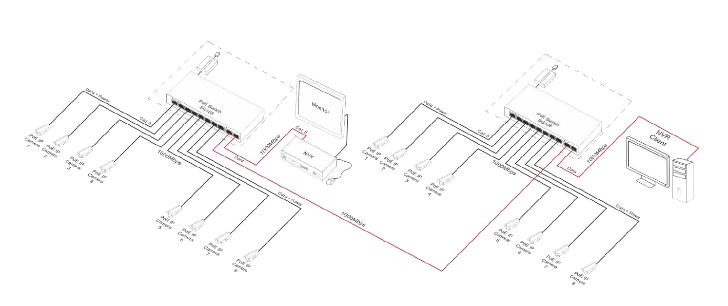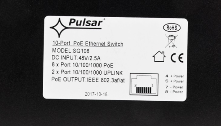 Der SG108 ist ein 10-fach PoE+ Highspeed-Switch. Es können bis zu 8 Kameras an den Switch angeschlossen und über die PoE-Ports mit Spannung versorgt werden. Der Switch verfügt über eine automatische Erkennung des PoE/PoE+ Standards. Das Gesamtbudget für PoE beträgt 96W (max. 30W je Port). Der Switch hat zudem zwei Uplink-Ports mit ebenfalls GigaBit-Anbindung. Alle Ports verfügen über Auto MDI/MDIX und Auto Crossover.