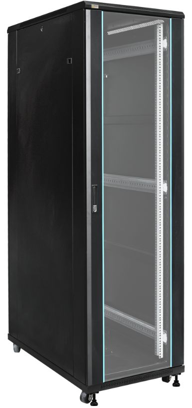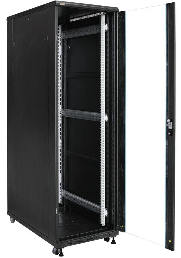 Der fahrbare 19″-Schrank ZRS4261 bietet 42 Höheneinheiten für CCTV-Verteiler, Patchfelder und 19″-Infrastruktur jeder Art. Er lässt sich bequem über die Schwerlastrollen zum Montageort transportieren und kann über die beiliegenden Stellfüße fixiert werden. Die hochwertige Verarbeitung und ein durchdachtes Installationsmanagement für Montagestege, Kabelhalter und Rack-Technik erleichtern die Fertigung, Erweiterung und Wartung der Systeme. Die Fronttür besteht aus 5mm gehärtetem Glas. Durch den justierbaren Abstand der vorderen und hinteren Schienen ist der Schrank an die unterschiedlichste Technik anpassbar. Dank der 1000mm Bautiefe können auch Einbauelemente mit großer Tiefe installiert werden.Montagemöglichkeiten für Belüftungssysteme (RAWP und andere) sowie spezielle Belüftungsbleche an Vorder-, Unter- und Oberseite schützen vor Stauhitze und erleichtern das Temperaturmanagement.